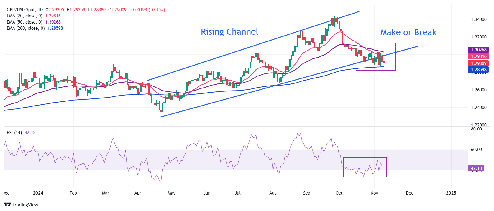 The Pound Sterling trades at a make or a break against the US Dollar near the breakdown region of the rising channel pattern. The near-term trend of GBP/USD remains bearish as the 20-day and 50-day Exponential Moving Average (EMAs) around 1.3000 and 1.3035, respectively, are declining. However, the pair remains well-supported by the 200-day Exponential Moving Average (EMA) around 1.2860.